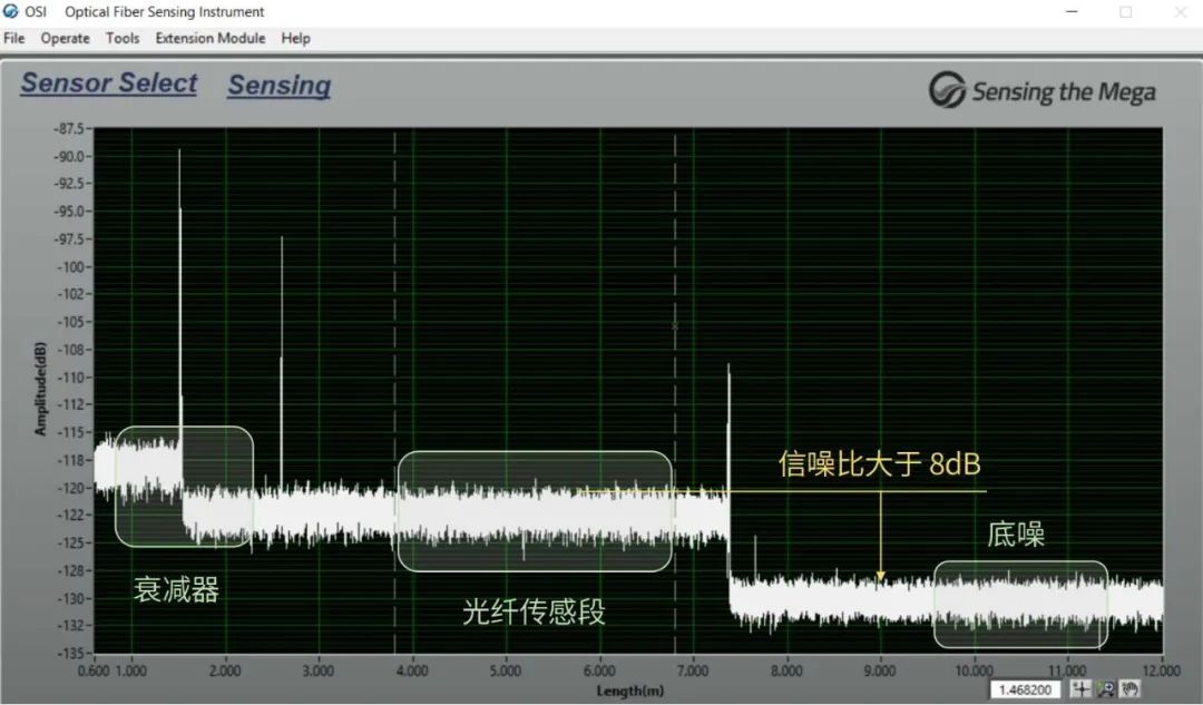 零点位置对应设备DUT口,7.5m以后是无效信号,为设备底噪,约-130dB;7.5m以前是光纤链路的散射信号,衰减器约在1.5m附近,2.5m~7.5m为光纤传感段。