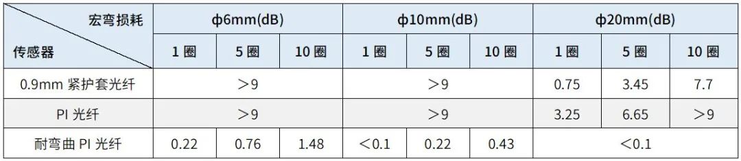 2)光纤链路某位置有小半径、小角度弯曲,可通过排除故障、减小宏弯或更换光纤传感器来降低损耗。另外,不同光纤类型其弯曲半径和损耗关系有较大差异。表1汇总了三种常见光纤应变传感器在波长1550nm时,弯曲半径和损耗的关系,以供参考。
