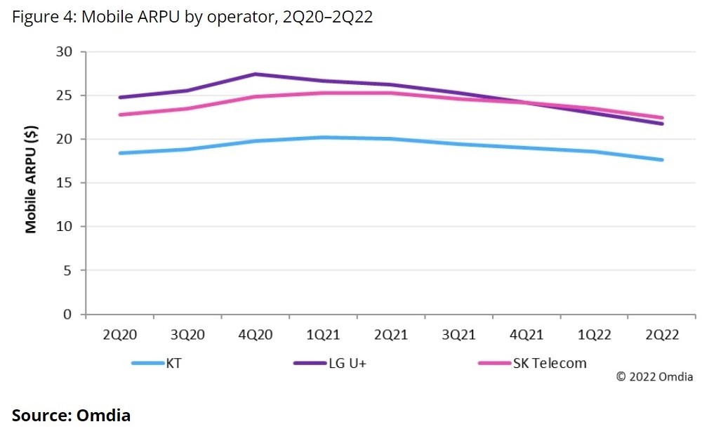 浏览次数:96市场研究公司Omdia一份报告称韩国5G运营商的每用户销售额ARPU在经历一段时间上升之后开始下降。Omdia分析师Anshika Gandotra在报告中称,经过两年多的持续增长,韩国电信KT, LG U+的移动ARPU都开始下滑,相比之下SK电信还保持持平,5G的用户数增长和销售收入增长都开始停滞。在韩国,5G的推出一度阻止了ARPU的下滑,但是从2021年1季度以来,移动运营商APRU又开始下滑,这期间尽管运营商也采取了不少措施,比如SK电信一度将部分5G资费下调百分之三十。